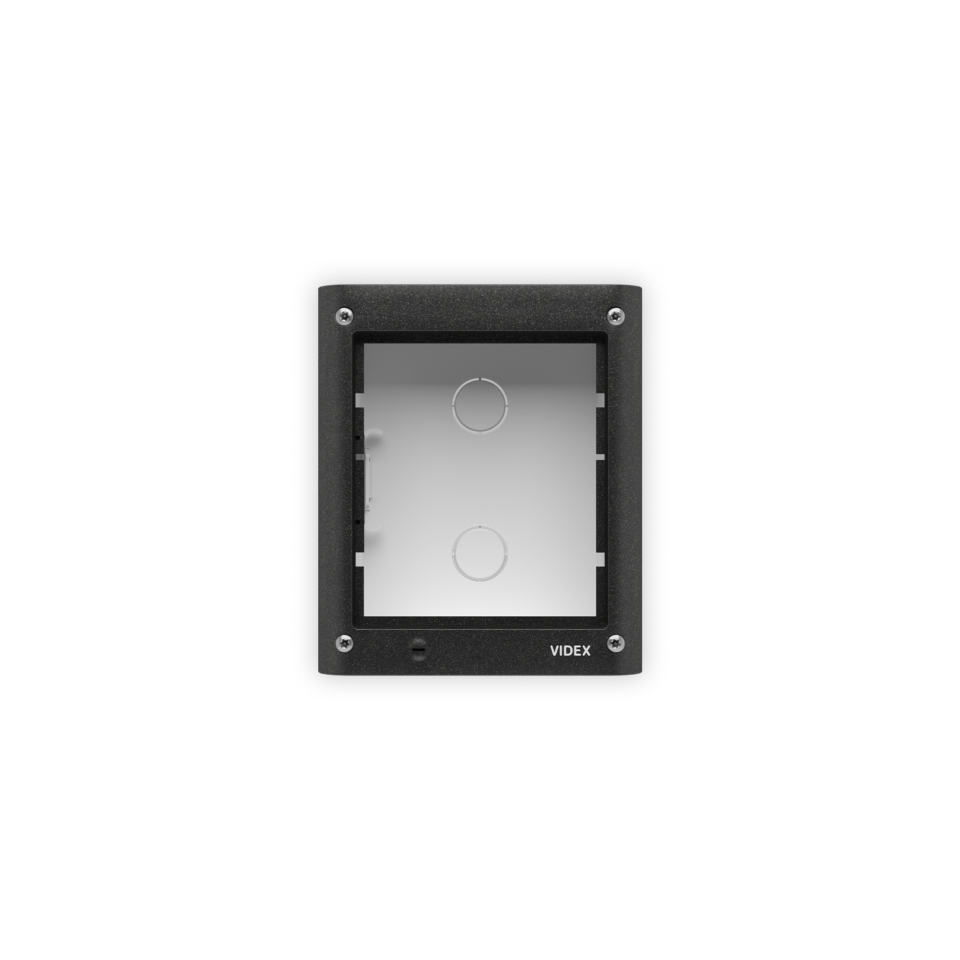 Composto da: scatola da incasso e telaio portamoduli. Il telaio comprende 4 viti di sicurezza tipo Torx, una guarnizione anti-infiltrazioni e cerniere laterali per consentire l’apertura del telaio per l’installazione o ispezione. Dimensione scatola: 120x143x45mm, dimensione telaio: 135x160x17mm, colore grigio canna di fucile.