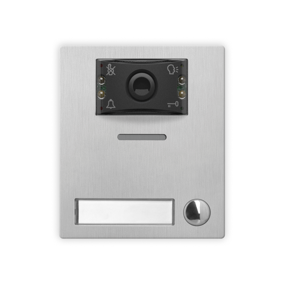 Modulo audio/video a 1 pulsanti serie 4000 per sistema VX2300, telecamera integrata CMOS da 1/4" a colori con sensibilità min 1 Lux e risoluzione da 976x582 (PAL), visione wide angle (V80°-170°H). 4 LED luce bianca per la visione notturna. Microfono ed altoparlante integrato 8Ω/2W e funzione audio full-duplex. Lettore di prossimità RFID integrato (125kHz EM4102) per l'utilizzo fino a 1.000 chiavi di cui fino a 60 programmabili direttamente dal modulo utilizzando la card master in dotazione.Interfaccia BUS-485. Connettore IDC per il collegamento tramite cavo flat (in dotazione) con altri moduli opzionali (massimo 8 moduli per un totale di 42 pulsanti). 4 LED di segnalazione visiva di stato impianto: occupato, chiamata in corso, inizio conversazione ed apertura porta. Segnalazioni acustiche per ipovedenti: inizio conversazione ed apertura porta. Tempo di apertura porta e conversazione configurabili. 1 relè di serie a contatti puliti C-NO-NC (max 24Vac/dc - 2A) con la possibilità di configurare la scarica capacitiva (max 12Vac/dc - 1A) per il pilotaggio diretto della serratura, un'uscita SSR (relè stato solido, max 60Vdc/40Vac - 0,1A) per l'attivazione del secondo cancello ed un ingresso per l'apertura porta diretta (PTE). Livelli del microfono e dell' altoparlante regolabili. Retroilluminazione del cartellino informativo con LED di colore blu. Microfono da alloggiare nel vano specifico dei telai porta moduli che consente una migliore resa fonica anche in ambienti rumorosi azzerando inoltre eventuali problemi di effetto larsen. Placca in acciaio inox satinato AISI 316 (marine grade) che conferisce durabilità in installazioni soggette ad agenti atmosferici e in prossimità di ambienti marini. Placca antivandalica IK07 e grado di protezione IP65. Temperatura di esercizio -20°/+60°C. Alimentazione da BUS. Configurazione semplificata del dispositivo attraverso dip-switch oppure kit di programmazione cod. 2209. Dimensioni 103x120x43mm. Ingombro 1 modulo.