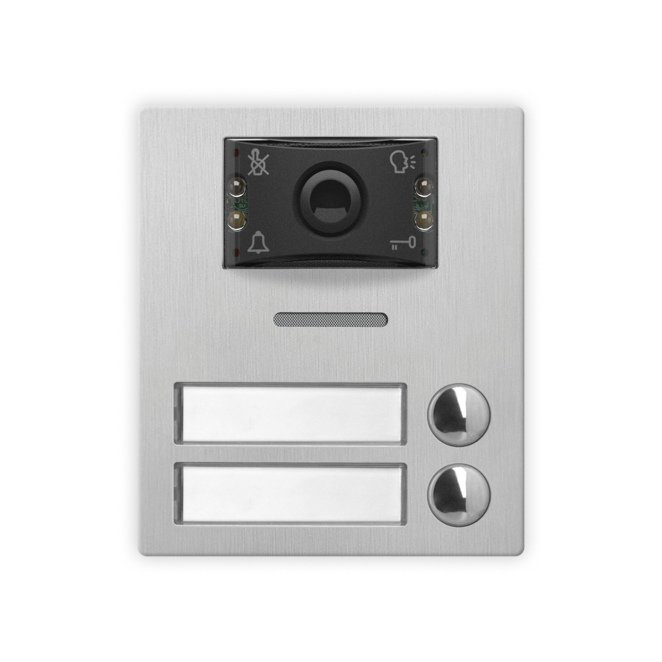 Modulo audio/video a 2 pulsanti serie 4000 per sistema VX2300, telecamera integrata CMOS da 1/4" a colori con sensibilità min 1 Lux e risoluzione da 976x582 (PAL), visione wide angle (V80°-170°H). 4 LED luce bianca per la visione notturna. Microfono ed altoparlante integrato 8Ω/2W e funzione audio full-duplex. Lettore di prossimità RFID integrato (125kHz EM4102) per l'utilizzo fino a 1.000 chiavi di cui fino a 60 programmabili direttamente dal modulo utilizzando la card master in dotazione. Interfaccia BUS-485. Connettore IDC per il collegamento tramite cavo flat (in dotazione) con altri moduli opzionali (massimo 8 moduli per un totale di 42 pulsanti). 4 LED di segnalazione visiva di stato impianto: occupato, chiamata in corso, inizio conversazione ed apertura porta. Segnalazioni acustiche per ipovedenti: inizio conversazione ed apertura porta. Tempo di apertura porta e conversazione configurabili. 1 relè di serie a contatti puliti C-NO-NC (max 24Vac/dc - 2A) con la possibilità di configurare la scarica capacitiva (max 12Vac/dc - 1A) per il pilotaggio diretto della serratura, un'uscita SSR (relè stato solido, max 60Vdc/40Vac - 0,1A) per l'attivazione del secondo cancello ed un ingresso per l'apertura porta diretta (PTE). Livelli del microfono e dell' altoparlante regolabili. Retroilluminazione del cartellino informativo con LED di colore blu. Microfono da alloggiare nel vano specifico dei telai porta moduli che consente una migliore resa fonica anche in ambienti rumorosi azzerando inoltre eventuali problemi di effetto larsen. Placca in acciaio inox satinato AISI 316 (marine grade) che conferisce durabilità in installazioni soggette ad agenti atmosferici e in prossimità di ambienti marini. Placca antivandalica IK07 e grado di protezione IP65. Temperatura di esercizio -20°/+60°C. Alimentazione da BUS. Configurazione semplificata del dispositivo attraverso dip-switch oppure kit di programmazione cod. 2209. Dimensioni 103x120x43mm. Ingombro 1 modulo.