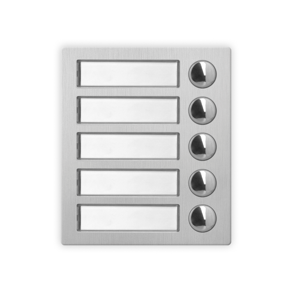 Modulo pulsanti di chiamata a 5 pulsanti serie 4000 per sistemi IPure, VX2300 e GSM. Retroilluminazione dei cartellini portanomi con LED di colore blu. Connettore IDC per il collegamento tramite cavo flat (in dotazione) con altri moduli opzionali (massimo 8 moduli per un totale di 42 pulsanti). Placca in acciaio inox satinato AISI 316 (marine grade) che conferisce durabilità in installazioni soggette ad agenti atmosferici e in prossimità di ambienti marini. Placca antivandalica IK07 e grado di protezione IP65. Temperatura di esercizio -20°/+60°C. Dimensioni 103x120x43mm. Ingombro 1 modulo.