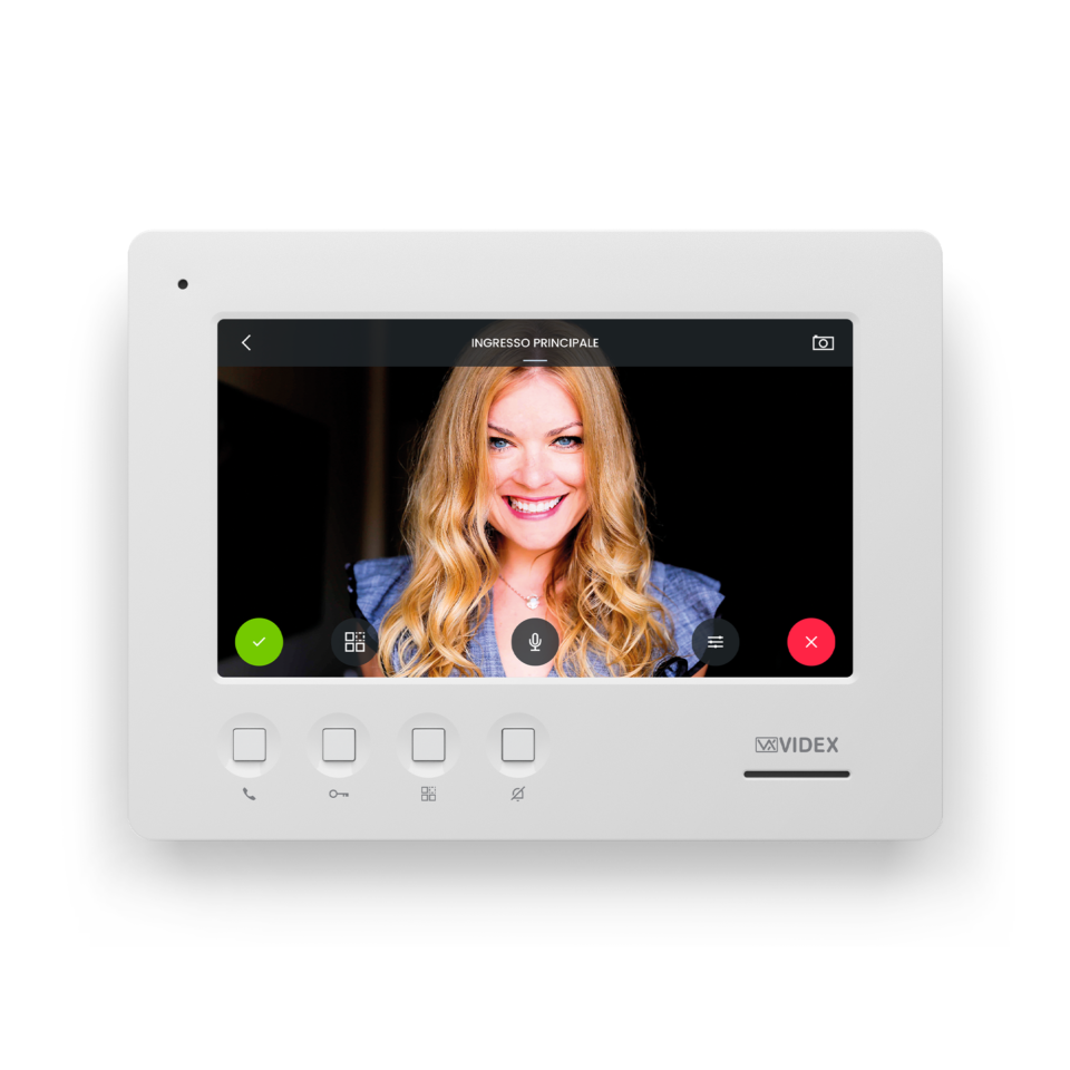 Videocitofono serie 6700 connesso per sistema VX2300, sistema operativo Linux Embedded, TFT LCD da 7” 16/9 alta risoluzione (800x480 pixel) full touch capacitivo, viva voce full-duplex, sensore di temperatura/umidità, 2 ingressi attivo/basso, 2 uscite relè attivabili localmente (C, NO - max 35Vdc 50mA), 4 pulsanti meccanici configurabili oppure dedicati a funzioni preimpostate: conversazione/autoaccensione, apri- porta, chiamata intercomunicante (4), servizio privacy, ecc. Regolazione contrasto, luminosità e volume di chiamata. Ingresso chiamata di piano, funzione intercomunicante senza limiti configurabile da schermo. Funzioni: privacy programmabile attraverso menù GUI, widget meteo, commutazione posti esterni audio/video o telecamere TVCC implementate con protocollo RTSP, registro eventi consultabile in locale oppure attraverso la Videx APP, implementazione TVCC con funzione PIP. Funzione cronotermostato smart gestibile in locale oppure attraverso la Videx APP. Browser integrato. Modulo dongle WI-FI di serie per funzioni di connettività al VIDEX CLOUD ed integrazioni con terze parti. Configurazione del dispositivo attraverso menù GUI da schermo. Materiale in ABS colore bianco. Alimentazione da BUS oppure 18Vdc opzionale con cod. 323/18. Dimensioni: 200x150x27mm. Installazione a parete, opzionale con base da tavolo cod. 67931.
