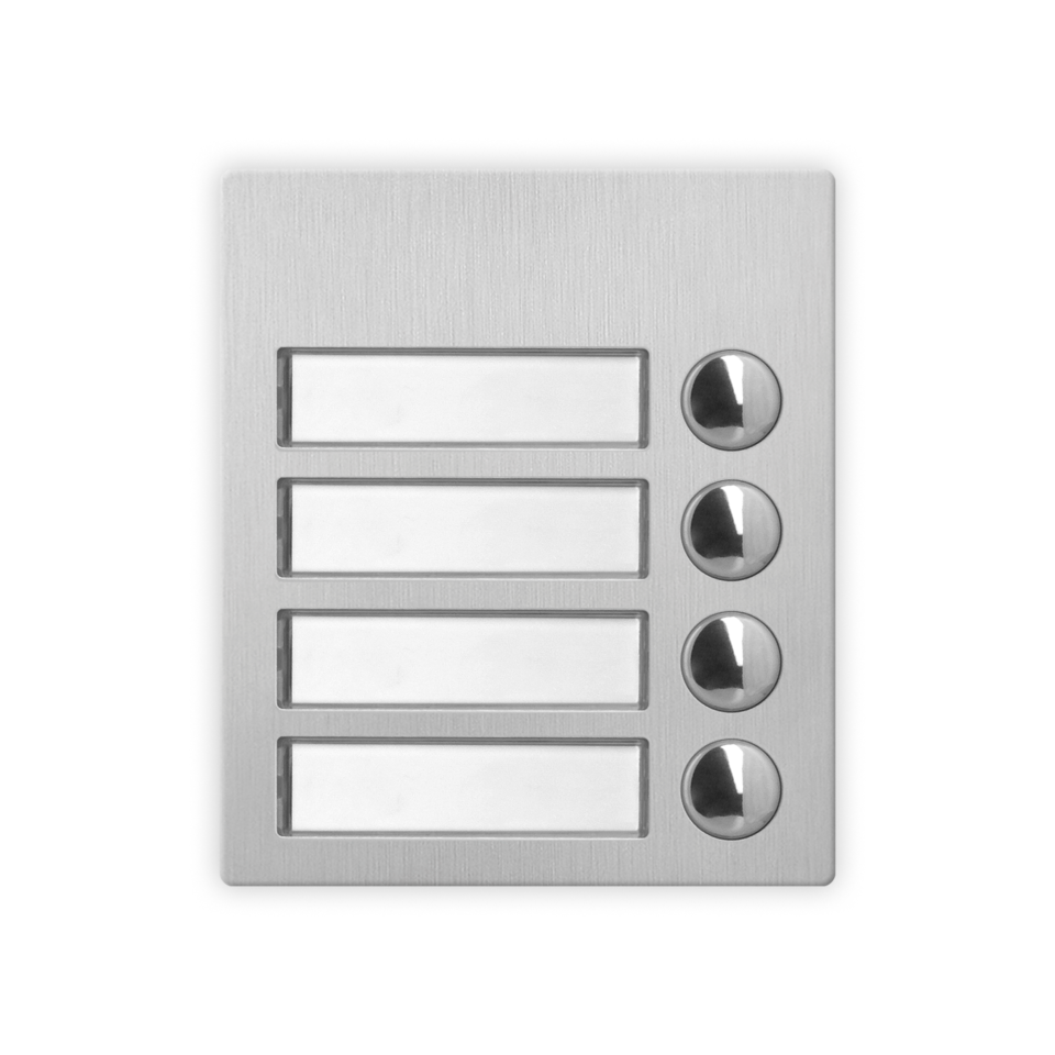 Modulo pulsanti di chiamata a 4 pulsanti serie 4000 per sistemi IPure, VX2300 e GSM. Retroilluminazione dei cartellini portanomi con LED di colore blu. Connettore IDC per il collegamento tramite cavo flat (in dotazione) con altri moduli opzionali (massimo 8 moduli per un totale di 42 pulsanti). Placca in acciaio inox satinato AISI 316 (marine grade) che conferisce durabilità in installazioni soggette ad agenti atmosferici e in prossimità di ambienti marini. Placca antivandalica IK07 e grado di protezione IP65. Temperatura di esercizio -20°/+60°C. Dimensioni 103x120x43mm. Ingombro 1 modulo.