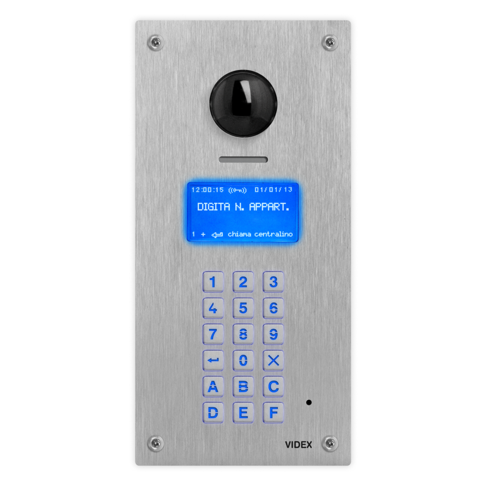 Targa audio/video con tastiera numerica serie FLUSH per sistema IPure compreso di telecamera autoiris CMOS da 1/4" a colori con sensibilità 3.3V/lux-sec@550nm (min 0.1lux) e risoluzione da 1280x720(720p/1Mpx) /640x480(VGA)/352x288(CIF)/320x240(QVGA)/176x144(QCIF), framerate @30ips. Visione wide angle (V80°x170°H). Codec video H.264/H.263+/H.263, protocollo video RTP/RTSP. 4 LED luce bianca per la visione notturna. 1 microfono integrato, 1 altoparlante integrato 8Ω/2W, amplificatore in classe D da 1W. Funzione audio full-duplex (AEC) con riduzione digitale del rumore/disturbo. Codec audio G711 µ-law/A-law, protocollo audio Videx IPure/RTP. Frequenza di campionamento 8kHz. Lettore di prossimità RFID integrato (125kHz: EM4100/EM4102) per l'utilizzo fino a 10.000 chiavi cod. 955/T oppure card ISO3, la configurazione chiavi avviene attraverso PC utilizzando software IPure Wizard. Display grafico con retroilluminazione di colore blu 128x64px. Repertorio 10.000 contatti selezionabile da tastiera alfa numerica e visualizzabile da display. Interfaccia Wiegand (34 bit programmabile). Segnalazione su display dello stato impianto: occupato, chiamata in corso, comunicazione aperta e apertura porta. Segnalazioni acustiche per ipovedenti: comunicazione aperta e apertura porta. Programmazione configurabile del tempo di apertura porta e conversazione. Programmazione configurabile del tempo apertura porta e conversazione. 2 relè di serie a contatti puliti C-NO-NC (max 24Vac/dc - 2A), 2 ingressi di serie programmabili (PTE). 1 porta bus RS-485. Livelli del microfono e dell' altoparlante regolabili. Retroilluminazione dei pulsanti con LED di colore blu.. Protocollo proprietario Videx IPure/CloudNected. Multi-compatibilità con protocolli: SIP 2.0 (UDP), 802.1x, RTP, RTSP, HTTP. Placca in acciaio inox spazzolato AISI 316 (marine grade) che conferisce durabilità in installazioni soggette ad agenti atmosferici e in prossimità di ambienti marini. Placca antivandalica IK09 con spessore da 2,5 mm e grado di protezione IP65. Temperatura di esercizio -20°/+60°C. Alimentazione PoE 802.3af (Classe 0 - 12.95W) oppure 12Vdc ± 15%/400mA. Porta LAN RJ45 10/100 BASE-TX con Auto-MDIX, cavo raccomandato Cat-5 o superiori. Configurazione semplificata del dispositivo attraverso software IPure Wizard. Dimensioni placca 135x280x47mm. Scatola da incasso inclusa, dimensioni 120x263x45mm. Non richiede accessori di installazione.
