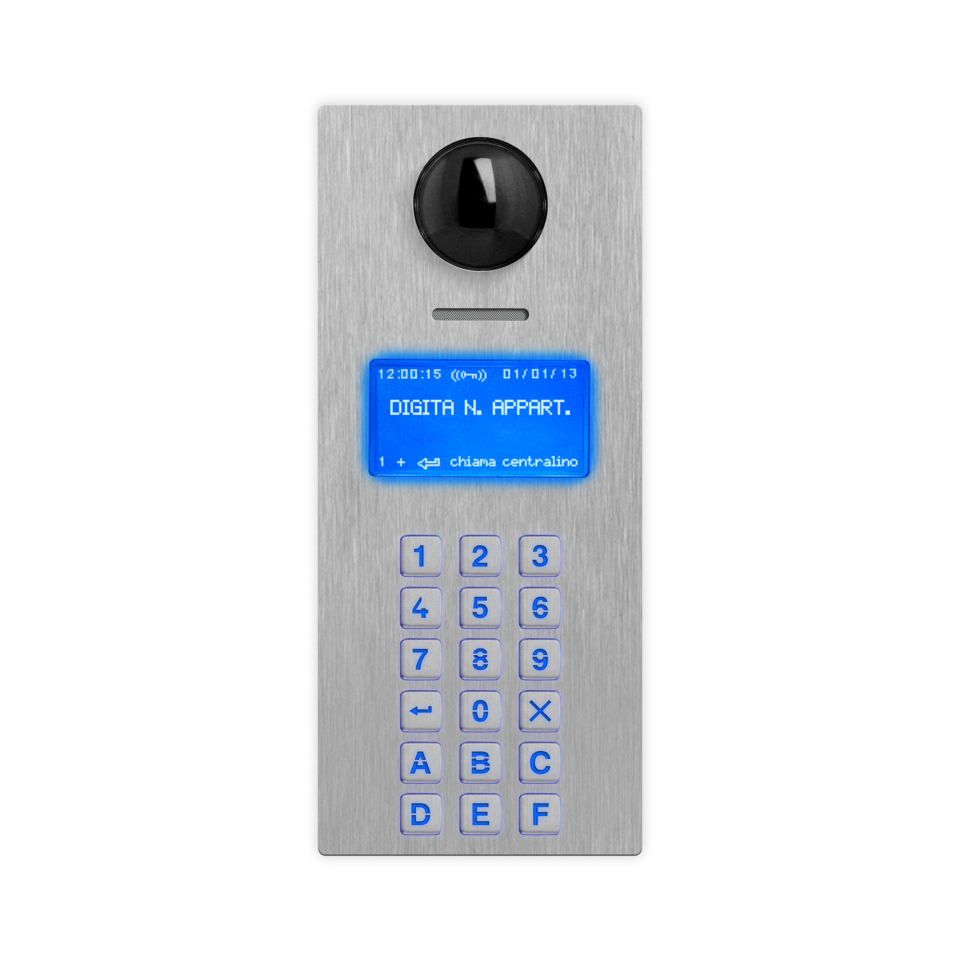 Targa audio/video con tastiera numerica serie 4000 per sistema IPure compresa di telecamera autoiris CMOS da 1/4" a colori con sensibilità 3.3V/lux-sec@550nm (min 0.1lux) e risoluzione da 1280x720(720p/1Mpx) /640x480(VGA)/352x288(CIF)/320x240(QVGA)/176x144(QCIF), framerate @30ips. Visione wide angle (V80°x170°H). Codec video H.264/H.263+/H.263, protocollo video RTP/RTSP. 4 LED luce bianca per la visione notturna. 1 microfono integrato, 1 altoparlante integrato 8Ω/2W, amplificatore in classe D da 1W. Funzione audio full-duplex (AEC) con riduzione digitale del rumore/disturbo. Codec audio G711 µ-law/A-law, protocollo audio Videx IPure/RTP. Frequenza di campionamento 8kHz. Lettore di prossimità RFID integrato (125kHz: EM4100/EM4102) per l'utilizzo fino a 10.000 chiavi cod. 955/T oppure card ISO3, la configurazione chiavi avviene attraverso PC utilizzando software IPure Wizard. Display grafico con retroilluminazione di colore blu 128x64px. Repertorio 10.000 contatti selezionabile da tastiera alfa numerica e visualizzabile da display. Interfaccia Wiegand (34 bit programmabile). Segnalazione su display dello stato impianto: occupato, chiamata in corso, comunicazione aperta e apertura porta. Segnalazioni acustiche per ipovedenti: comunicazione aperta e apertura porta. Programmazione configurabile del tempo di apertura porta e conversazione. Programmazione configurabile del tempo apertura porta e conversazione. 2 relè di serie a contatti puliti C-NO-NC (max 24Vac/dc - 2A), 2 ingressi di serie programmabili (PTE). 1 porta bus RS-485. Livelli del microfono e dell' altoparlante regolabili. Retroilluminazione dei pulsanti con LED di colore blu. Microfono da alloggiare nel vano specifico dei telai porta moduli che consente una migliore resa fonica anche in ambienti rumorosi azzerando inoltre eventuali problemi di effetto larsen. Protocollo proprietario Videx IPure/CloudNected. Multi-compatibilità con protocolli: SIP 2.0 (UDP), 802.1x, RTP, RTSP, HTTP. Placca in acciaio inox satinato AISI 316 (marine grade) che conferisce durabilità in installazioni soggette ad agenti atmosferici e in prossimità di ambienti marini. Placca antivandalica IK09 e grado di protezione IP65. Temperatura di esercizio -20°/+60°C. Alimentazione PoE 802.3af (Classe 0 - 12.95W) oppure 12Vdc ± 15%/400mA. Porta LAN RJ45 10/100 BASE-TX con Auto-MDIX, cavo raccomandato Cat-5 o superiori. Configurazione semplificata del dispositivo attraverso software IPure Wizard. Dimensioni 103x240mm. Ingombro 2 moduli.