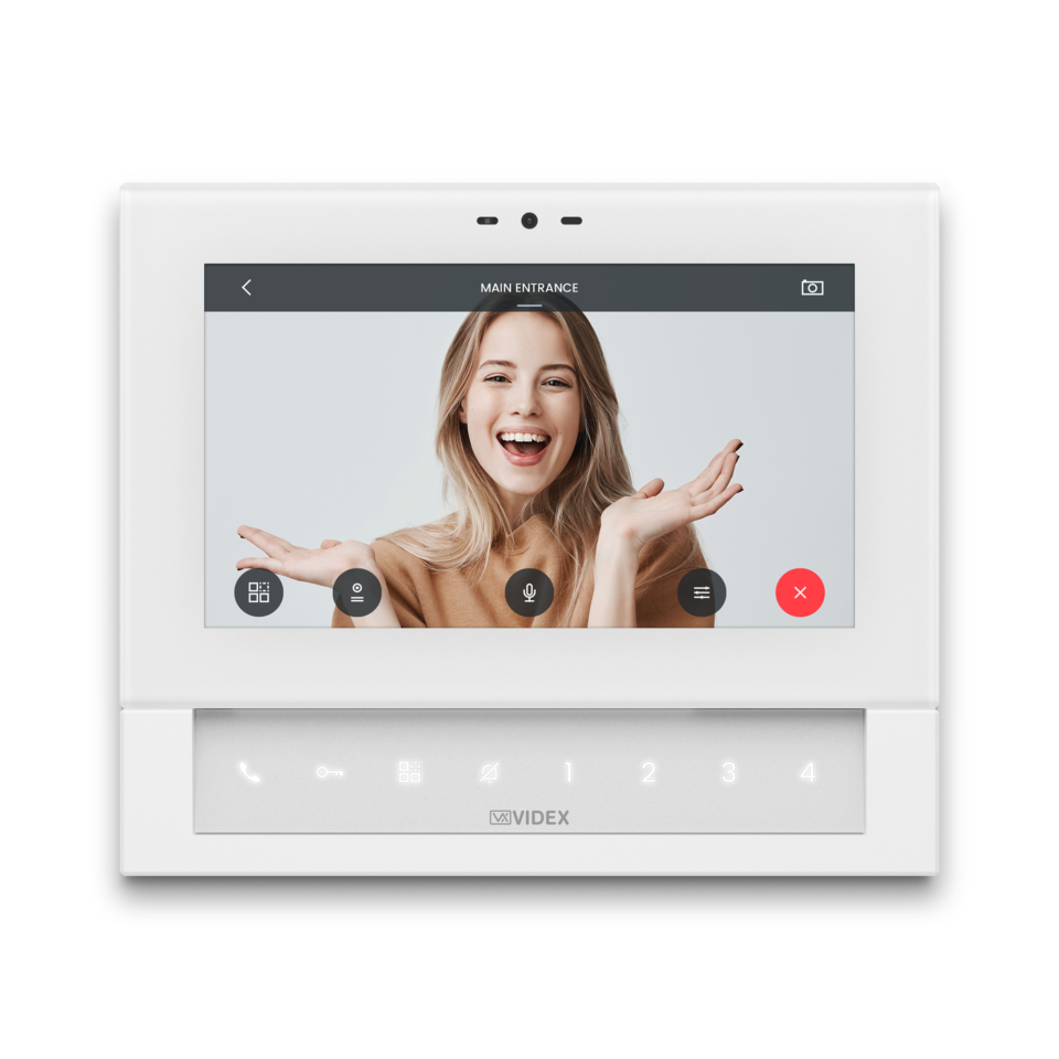 Videocitofono Serie Klass, sistema operativo Linux Embedded, TFT LCD da 7” 16/9 alta risoluzione (1024x600 pixel IPS) full touch capacitivo, cover lens da 3mm in vetro, viva voce full-duplex, sensore di temperatura/umidità, sensore di luminosità ambientale, sensore di prossimità, 2 ingressi attivo/basso, 2 uscite relè attivabili localmente (C, NO - max 35Vdc 50mA), 8 pulsanti soft-touch configurabili oppure dedicati a funzioni preimpostate: conversazione/autoaccensione, apri-porta, chiamata intercomunicante, commutazione telecamera/servizio privacy, ecc. Regolazione contrasto, luminosità e volume di chiamata. Ingresso chiamata di piano, funzione video-intercomunicante configurabile attraverso menù GUI (fino a 1080p). Funzioni: privacy programmabile attraverso menù GUI, widget meteo, commutazione posti esterni audio/video o telecamere TVCC implementate con protocollo RTSP, registro eventi consultabile in locale oppure attraverso la Videx APP, implementazione TVCC con funzione PIP. Funzione cronotermostato smart gestibile in locale oppure attraverso la Videx APP. Browser integrato, multi-compatibilità con protocolli: SIP 2.0, RTSP, HTTP. Modulo dongle WI-FI opzionale Cod. DNGL. Include la staffa Cod. KLBRW. Materiale in vetro e ABS colore bianco. Porta RJ-45 10/100 Mbps. Alimentazione PoE IEEE 802.3af (Classe 0) oppure 12Vdc - 650mA. Dimensioni: 195x165x30mm. Installazione a parete, opzionale con base da tavolo Cod. KLHFTS or Cod. KLHSTS.